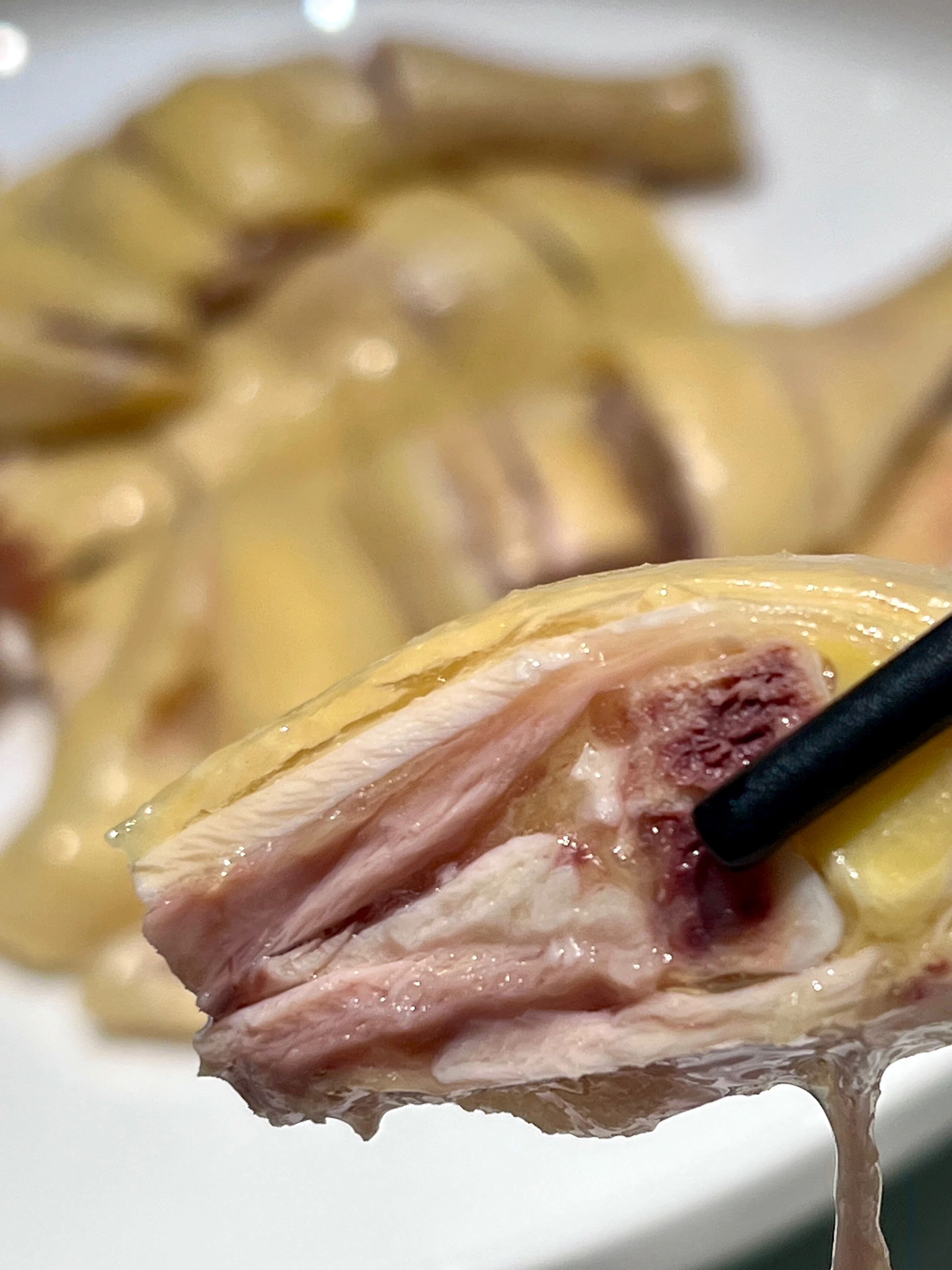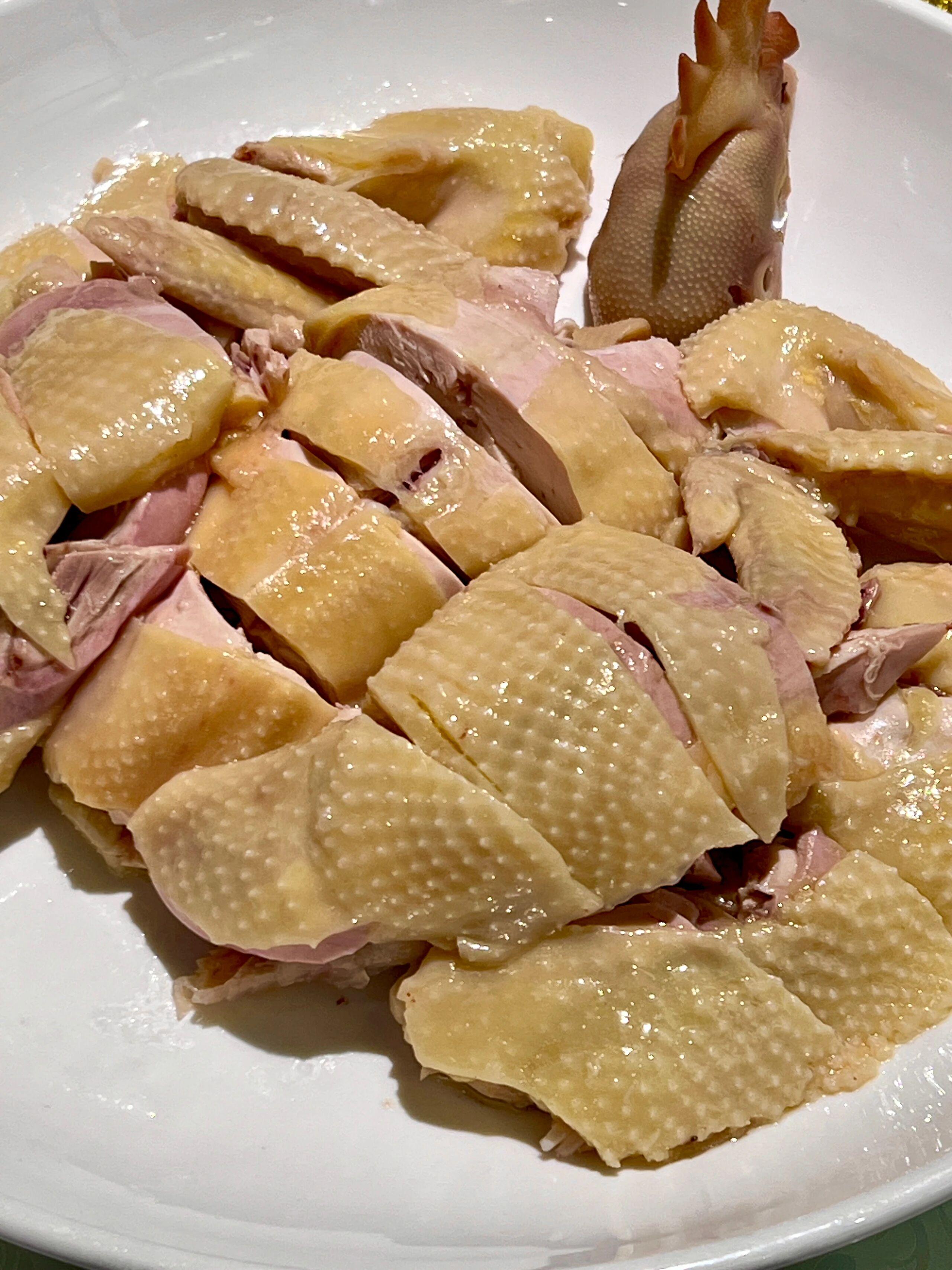 容太约我去她去年开的 佬佬餐厅 吃饭,从海心沙到番禺如同从上海的浦西到浦东,过个江差不多一个小时。落座就见一个“葵香鸡”的袋子,上面写着“彭总”。彭总,就是彭树挺先生,当年白天鹅宾馆的开业元老之一,是分管餐饮的副总盛宝优配,玉堂春暖以及葵花鸡的走红都是在彭总的直接指挥领导下。这只葵香鸡由彭总钦点,从养鸡场做熟了送来,自然与众不同。请厨房切了端出来,看这层鸡皮疙瘩,果然和以前吃过的不一样。