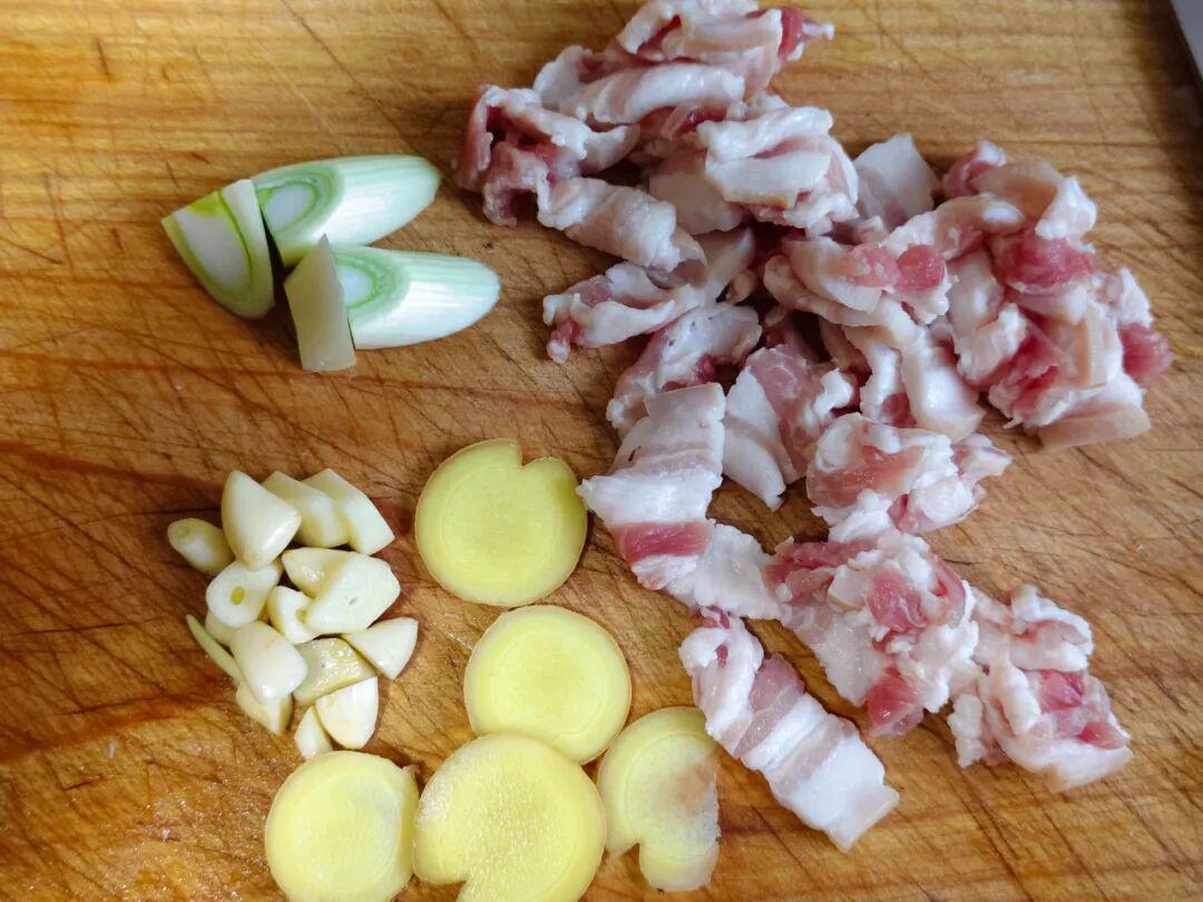 第四步,猪肉无需去皮,直接切成片,葱切小段,姜切片,蒜切碎