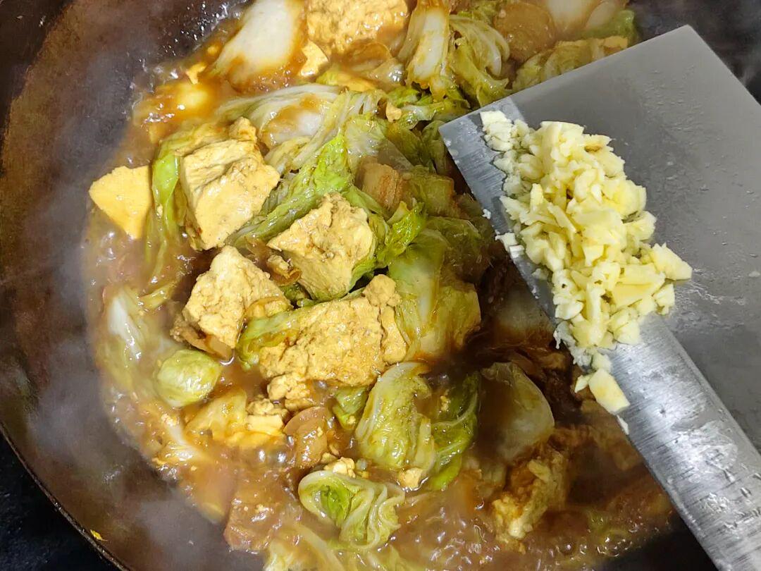 第十步,这时候的菜软烂可口,菜汁味道浓郁,加入蒜末下锅,拌匀即可出锅