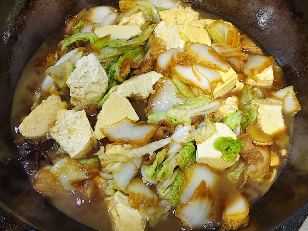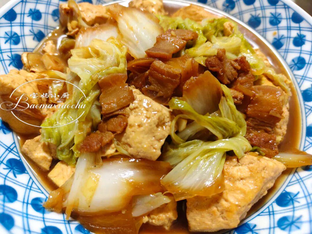 豆腐含植物蛋白,猪肉含动物蛋白和脂肪,在和白菜同炖的情况下,肉不油腻,菜更香,又能在白菜的粗纤维下,把猪肉消化后的废弃物给排出去。