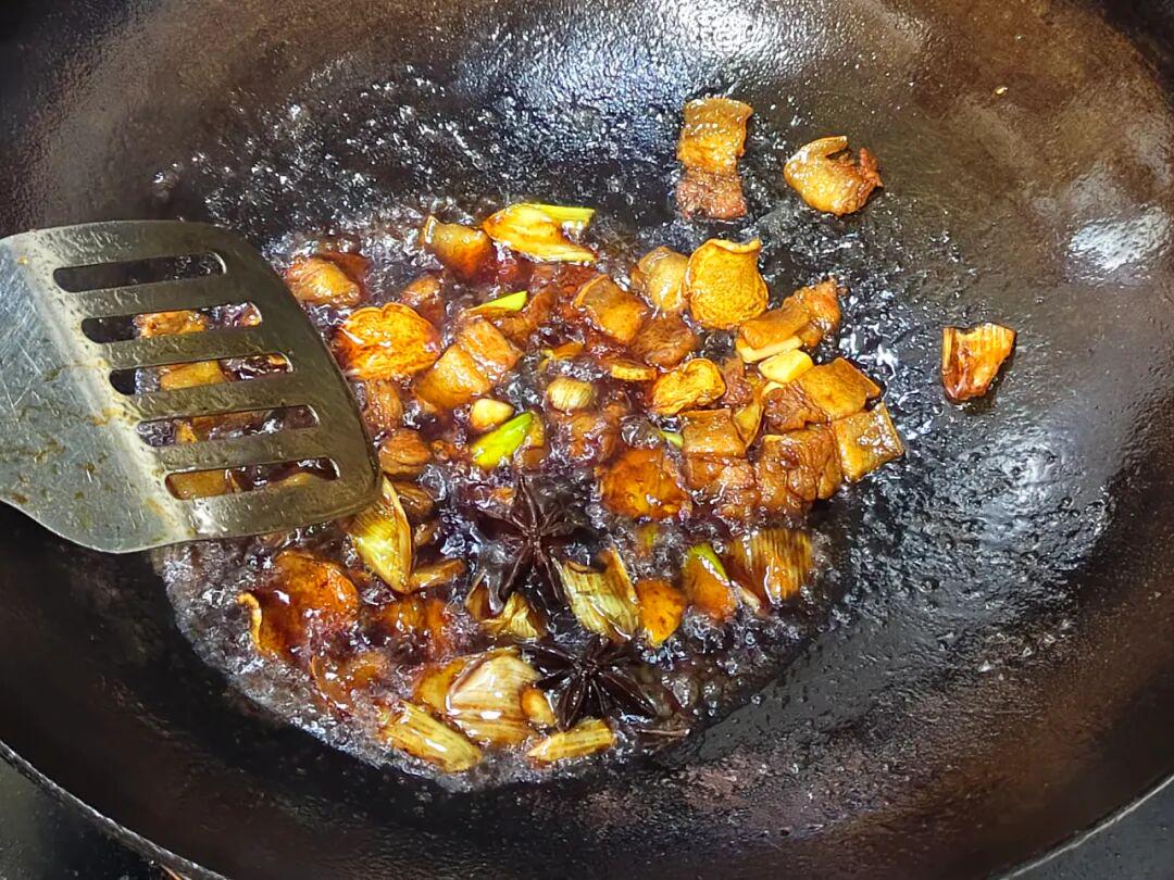 第五步,用肉有点少,炒锅里可以多放点植物油或者猪油,放入2个八角和姜片,炸香