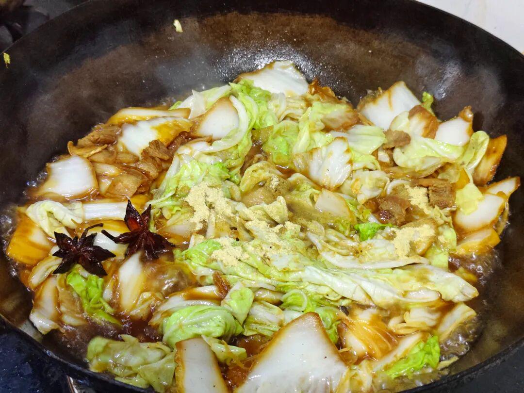 因为白菜炖的时候会出很多汤,所以加水的时候不能没过白菜,以免最后水塌塌,清汤清水不好吃。